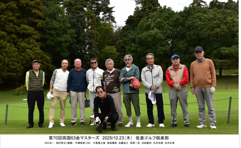 63回卒業同期による懇親ゴルフ会、両国63会マスターズが10月23日(木)に10名が参加し、佐倉カントリー倶楽部において開催されました。本大会も1994(平成6)年7月に第1回を開催して以来今回で70回を迎えました。参加者はいささか少なくなりましたが・・・。
